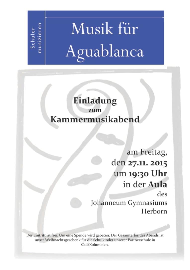 Bereits zum wiederholten Mal findet am 27. November der von Schülern gestaltete Kammermusikabend unter dem Motto «Musik für Aguablanca» in der Aula des Johanneum Gymnasiums statt. Die Mitglieder der Aguablanca-AG halten Getränke zu Ihrer Bewirtung bereit.